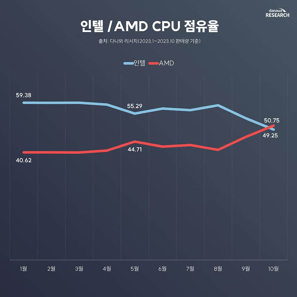 Los datos proporcionados por Danawa Research abarcan desde enero de este año hasta octubre pasado y muestran lo siguiente: AMD ha obtenido un enorme incremento en el mercado desde agosto, y en el décimo mes de 2023 ha superado al gigante de los chips.