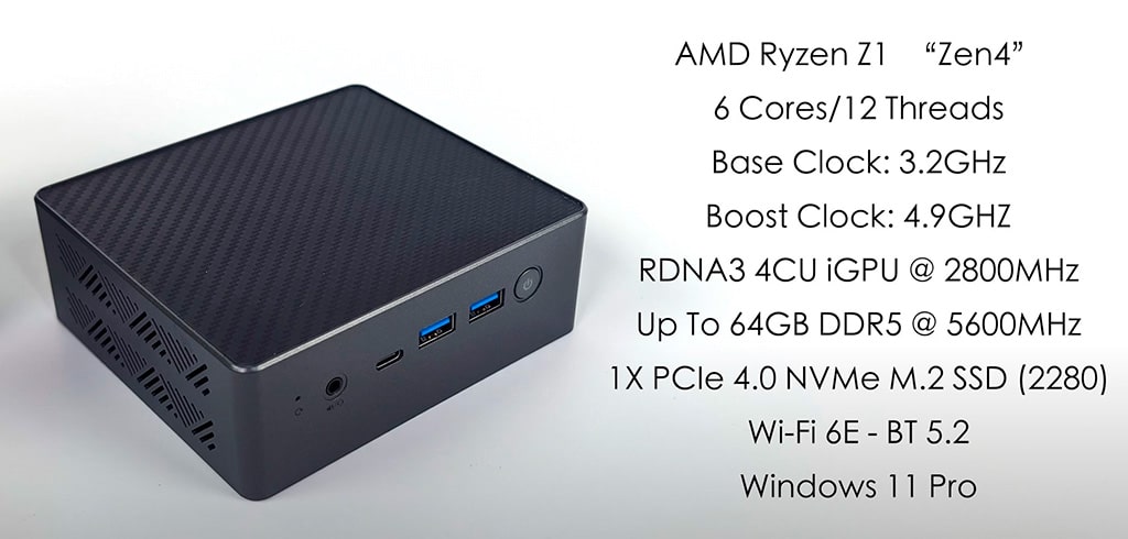 Las especificaciones del Mini-PC con la APU AMD Ryzen Z1 incluyen 6 núcleos y 12 hilos con frecuencias base y turbo de 3,20 GHz y 4,90 GHz, respectivamente. A nivel gráfico, cuenta con una GPU con 4 Compute Units y 256 Stream Processors a 2.700 MHz bajo la arquitectura AMD RDNA 3. Además, puede admitir hasta 64 GB de memoria RAM DDR5 a 5.600 MHz, espacio para un SSD PCIe 4.0 NVMe, y conectividad Wi-Fi 6E + Bluetooth 5.2, así como puertos USB y USB-C.