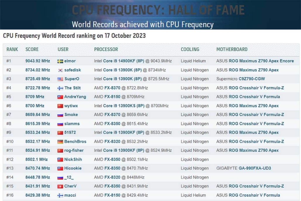 En concreto, el i7-14700KF y la ASUS ROG Maximus Z790 Apex Encore alcanzaron los 9,1 GHz, un nuevo récord de frecuencia establecido por Elmor en HWbot. Aunque esta cifra no se registró en la plataforma, Elmor sí logró registrar una frecuencia de 9044 MHz para el i9-14900KF, convirtiéndose en el Top 1 en HWbot. Para ello, se utilizó helio líquido, superando en 310 MHz el récord anterior obtenido con el i9-13900K.