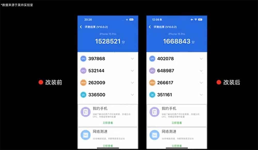 Para solucionar este problema, el mencionado creador de contenido chino realizó una modificación en su iPhone 15 Pro añadiendo una cámara de vapor. Después de hacer esto, el dispositivo modificado demostró un aumento significativo en los FPS en Genshin Impact. Además, en pruebas de rendimiento como AnTuTu y Solar Bay Unlimited, el iPhone modificado obtuvo resultados entre un 10 y un 20% mejores que el modelo original.