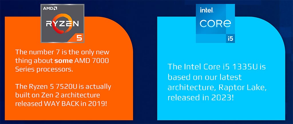 Intel utiliza como ejemplo el AMD Ryzen 5 7520U, un procesador lanzado en septiembre de 2022 basado en la arquitectura AMD Zen 2 lanzada en julio de 2019. Por lo tanto, estamos hablando de una arquitectura de casi 5 años. Intel compara esta CPU con su Core i5-1335U, que, por supuesto, utiliza una arquitectura Raptor Lake que debutó este mismo año.